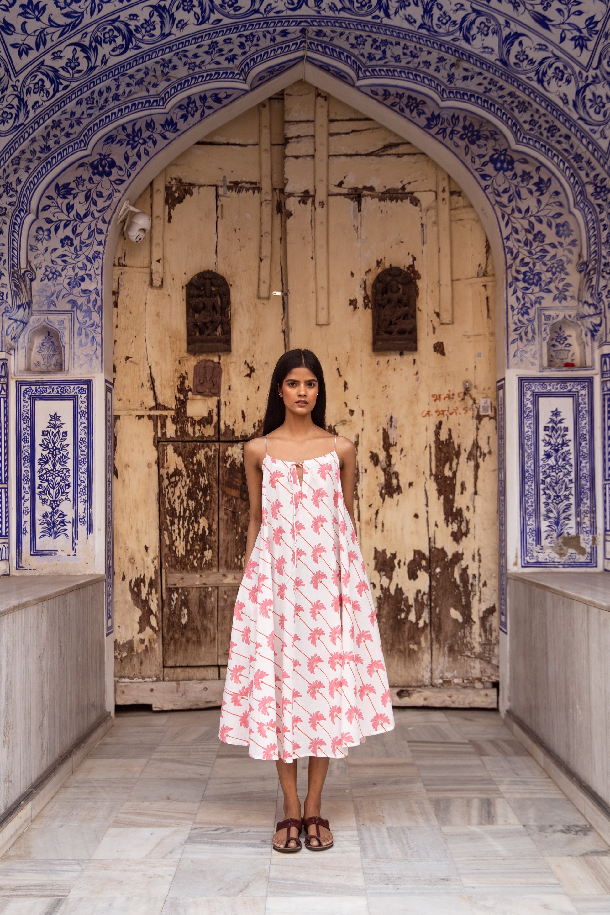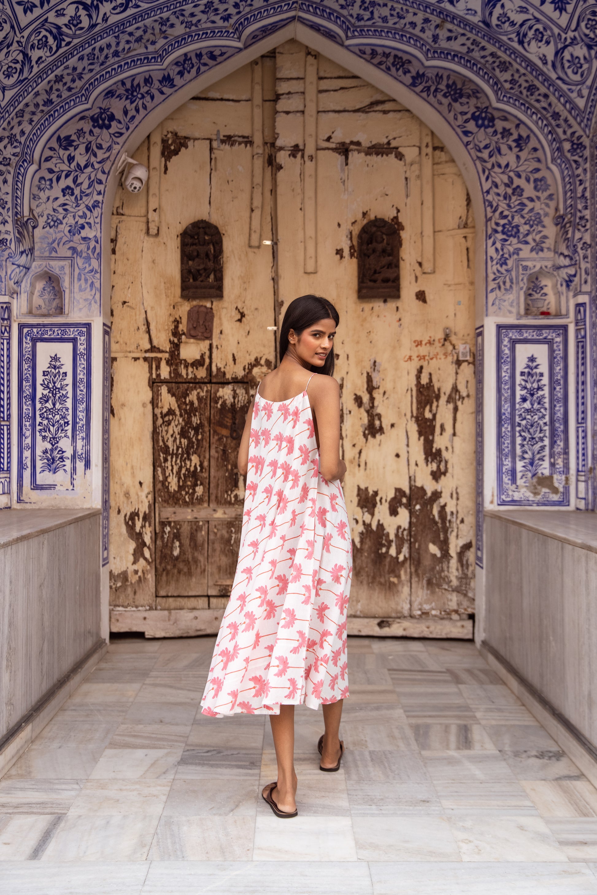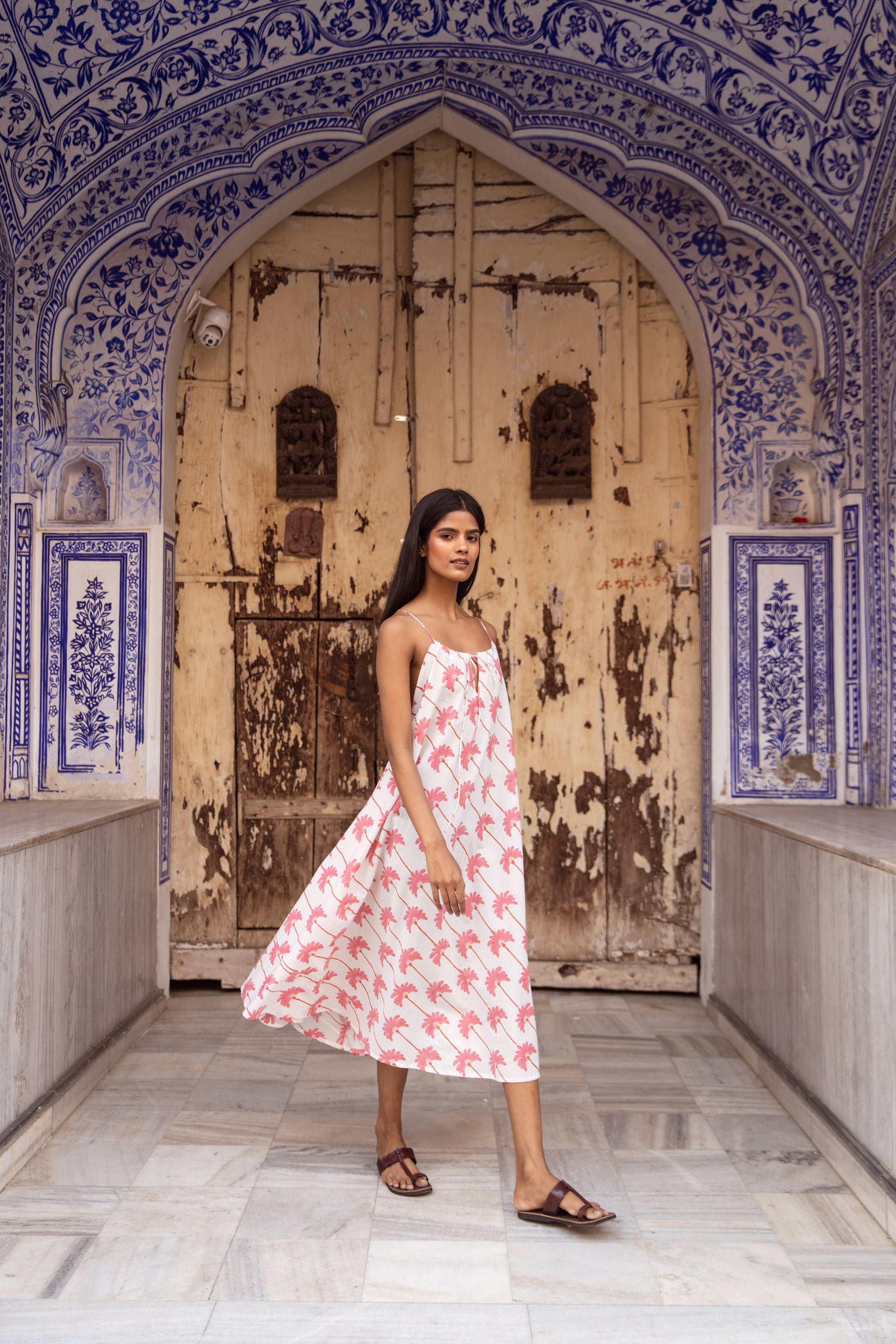 Hand block-printed in our DZUBI black panther custom print on soft, breathable cotton. This flowy midi length dress drapes effortlessly with its relaxed A-line cut and adjustable thin straps. Light, airy, and endlessly versatile—it’s the perfect piece to wear as a beach cover-up by day and accessorize into an elegant night look.