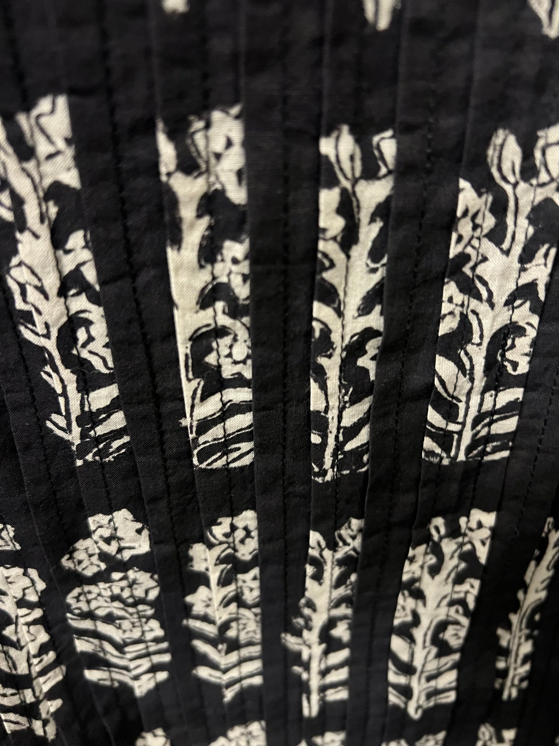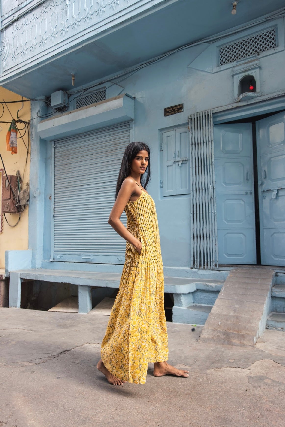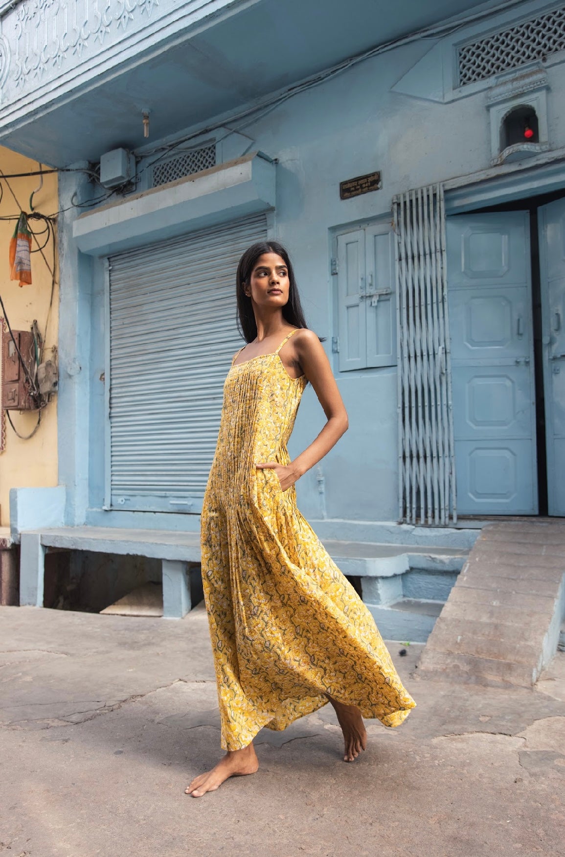 Ankle-length elegance in airy black and white flower motif block print. Pleated torso, adjustable straps, and hidden pockets: simplicity refined into sophistication.