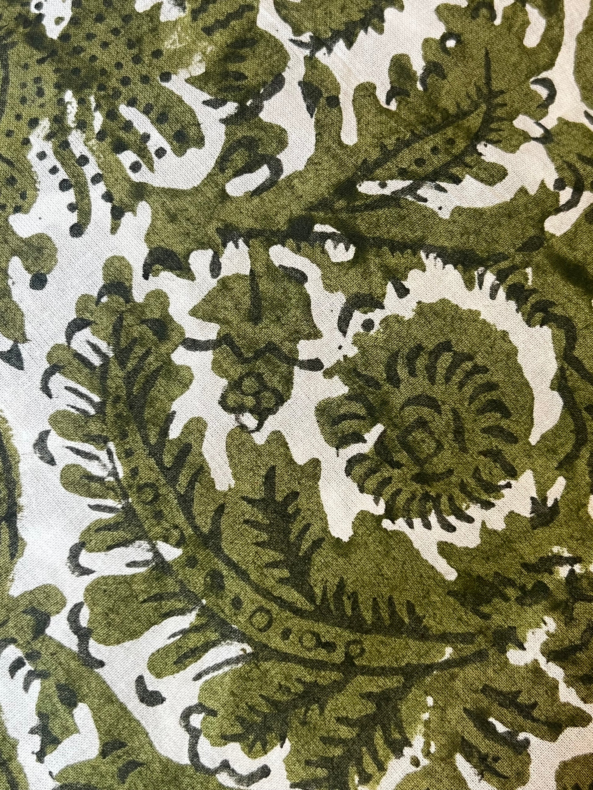 Hand block-printed in a gorgeous grass green flower motif on soft, breathable cotton. This flowy midi length dress drapes effortlessly with its relaxed A-line cut and adjustable thin straps. Light, airy, and endlessly versatile—it’s the perfect piece to wear as a beach cover-up by day and accessorize into an elegant night look.