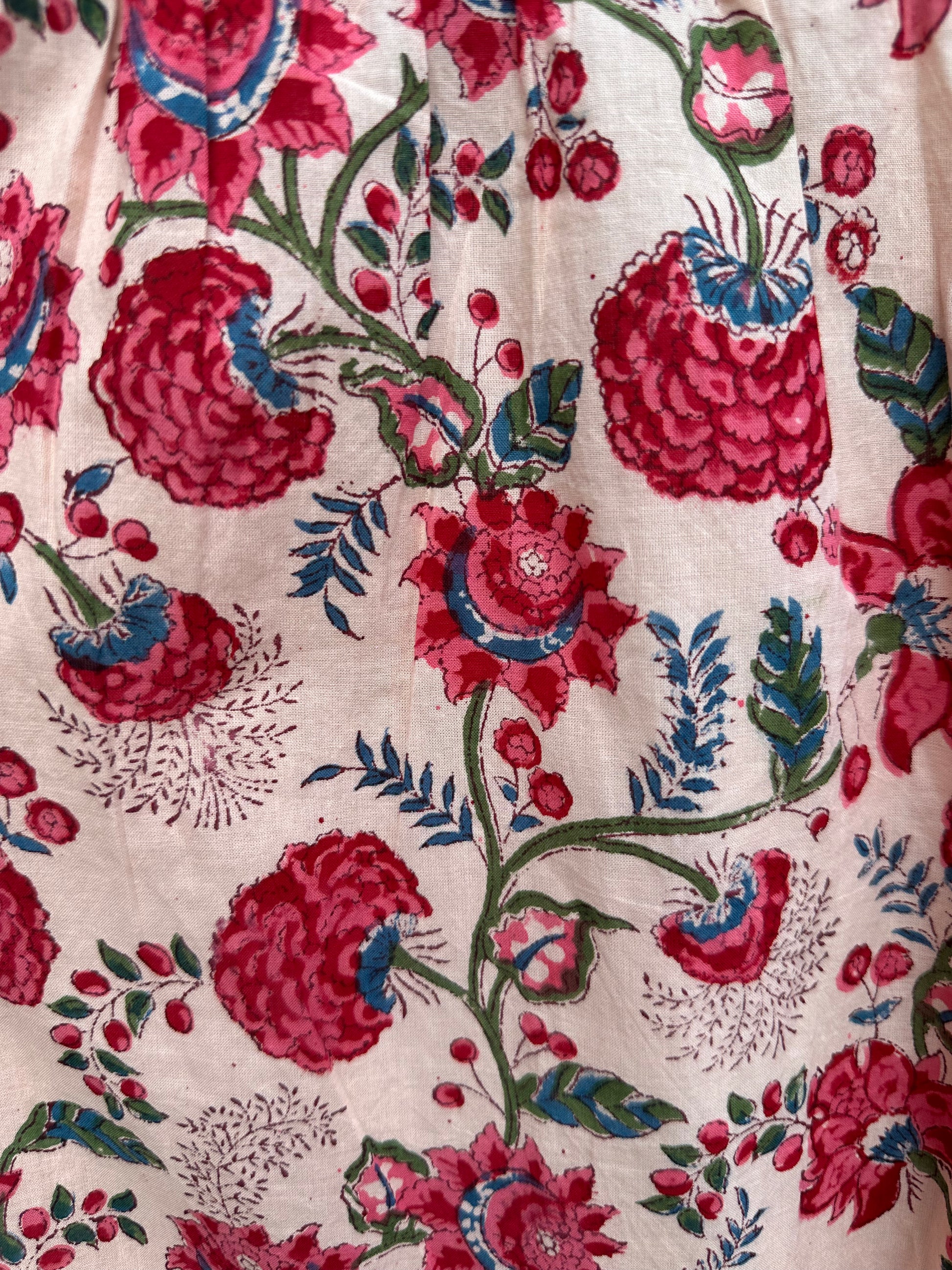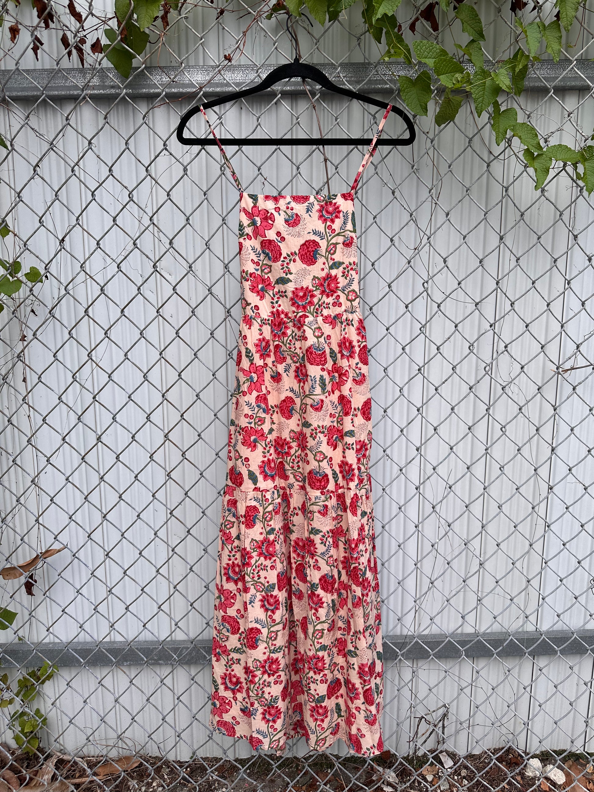 ankle-length sundress with a flowery block-print pattern, thin straps, and a striking open back with tie details. It’s flowy, feminine, and effortlessly chic.