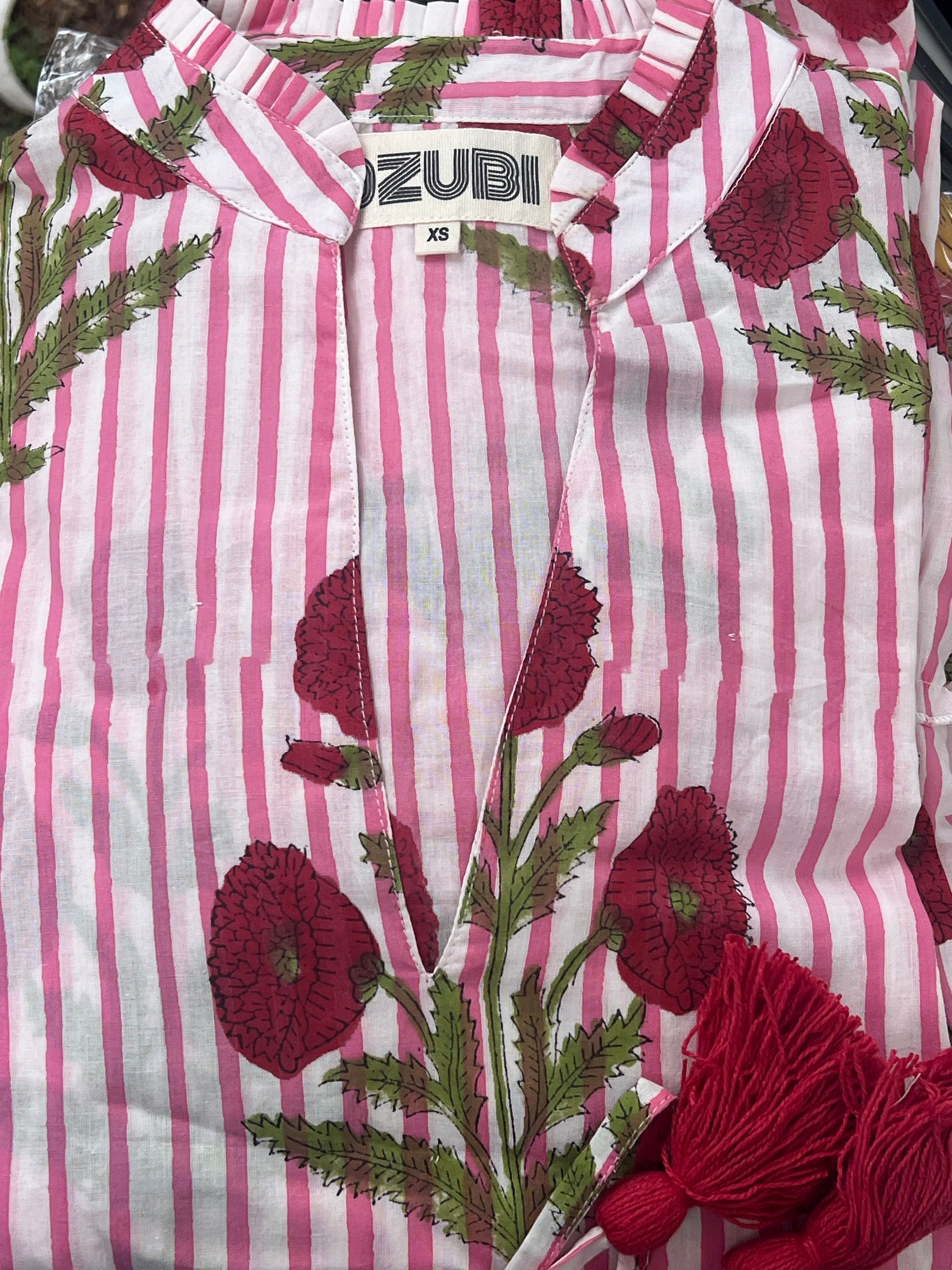 - Drawstring at the waist to cinch the dress with decorative tassels
